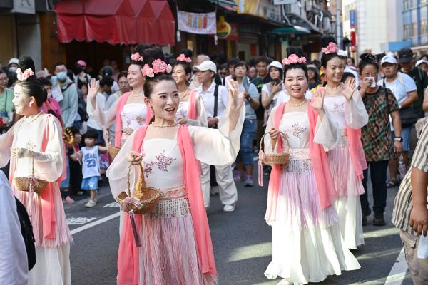 在踩街行進中,天國樂團演奏的曲目包括《法輪大法好》、《法輪聖王》、《法鼓法號震十方》、《法正乾坤》、《送寶》、《神聖的歌》、《佛恩聖樂》、《凱旋》,沿途贏得掌聲與喝彩。有民眾熱情地拿著手機拍攝天國樂團與仙女隊,還有不少民眾帶著孩子全家出動,跟在隊伍後方,一路一起前行。
