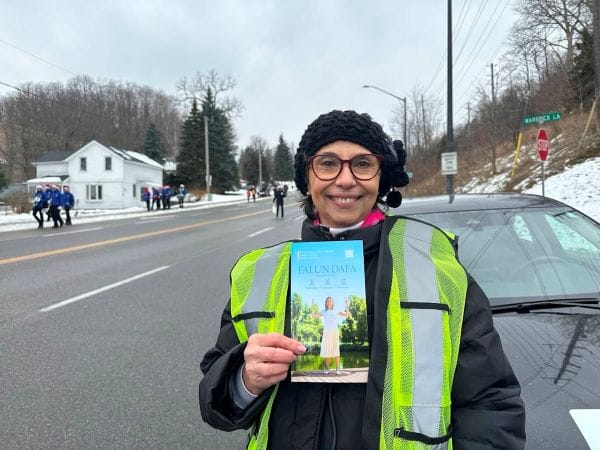 卡羅爾(Carol)是一名亞積士鎮的房地產從業者,她跟隨自己的團隊參加了亞積士聖誕遊行。在遊行開始前,她看到部分天國樂團學員在集體煉功,學員給她介紹了法輪功原則後,她請學員教她動作。