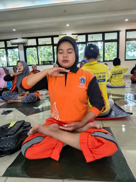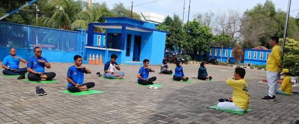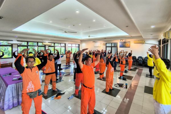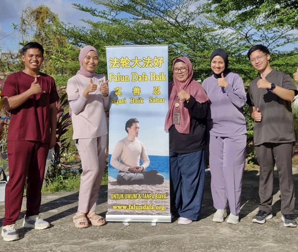 上午七點十五分,所有參與者一同學煉了五套功法。煉功結束後,社區健康中心主任阿德・薩菲特里・安達亞尼・阿姆蘭醫生(Dr. Ade Safitri Andayani Amran)表達了感謝:「法輪大法的宗旨──真、善、忍確實很棒,因為不僅促進身體健康,也促進內心的平和,而這一點對改善我們的健康至關重要。」