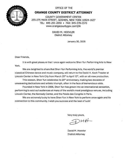 【明慧之窗記者宋芙瑛綜合編輯】二零二六年二月十八日,紐約上州橙縣地區檢察官大衛・胡弗勒(David Hoovler)先生親自向神韻藝術團頒發褒獎,感謝神韻藝術團創始人兼藝術總監D.F.先生的非凡貢獻。他同時祝賀神韻藝術團成立二十週年,祝福所有人火馬年快樂。
