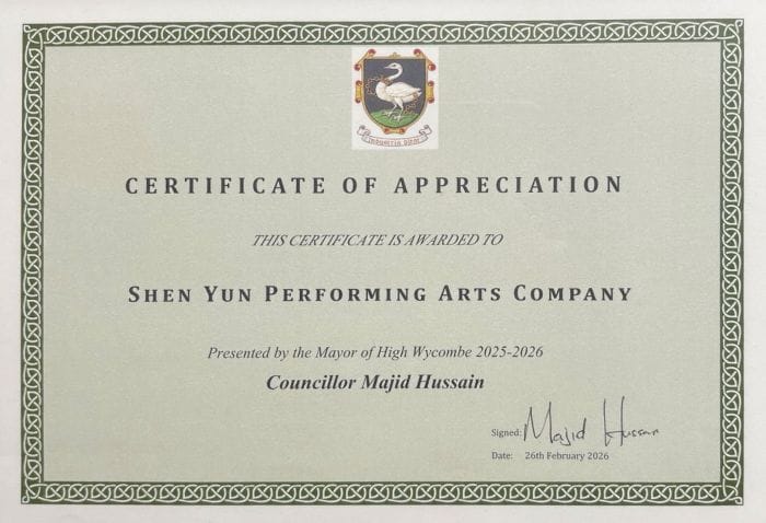 二零二六年二月二十六日,神韻環球藝術團在英國海威科姆市的威科姆天鵝劇院(Wycombe Swan Theatre)演出觀眾爆滿。當地市長馬吉德﹒侯賽因(Majid Hussain)專程來到劇院向神韻藝術團頒發感謝狀,以表彰其為當地社區帶來的精彩演出與文化貢獻。